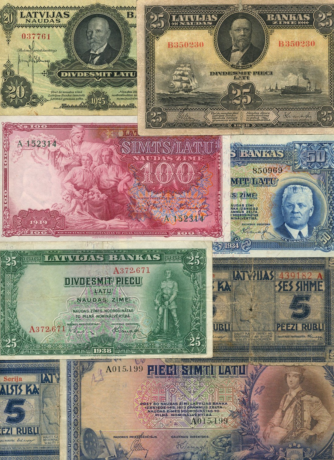Government Currency note, Latvia, 20 latu, 1925, red serial number 037761, green and black, J. Cakste at centre, value at centre and at each corner, reverse green, arms at centre, value at left and right, also 25 latu, 1928, red serial number B350230, black and pale orange, Valdemars at centre, reverse blue, arms and value, plus 500 latu, 1929, black serial number A 015199, blue and multicoloured, girl in National costume at right, allegorical symbols of harvest and Industry below, value top centre and at each corner, reverse blue, green and orange, pastoral scene at centre, caduceus at left and right, value to left and right, 25 latu, 1938, red serial number A 372671, green and lilac, Lacplesis at right, 100 latu, 1939, green serial number A 152314, purple, allegorical farming family, also 50 latu, 1934, serial number 850969, blue and multicoloured, also Latvian Government Currency notes, 5 rubli (4), ND (1919), red serial numbers, blue, maiden at centre, value at left and right (Pick 3d,e,f),