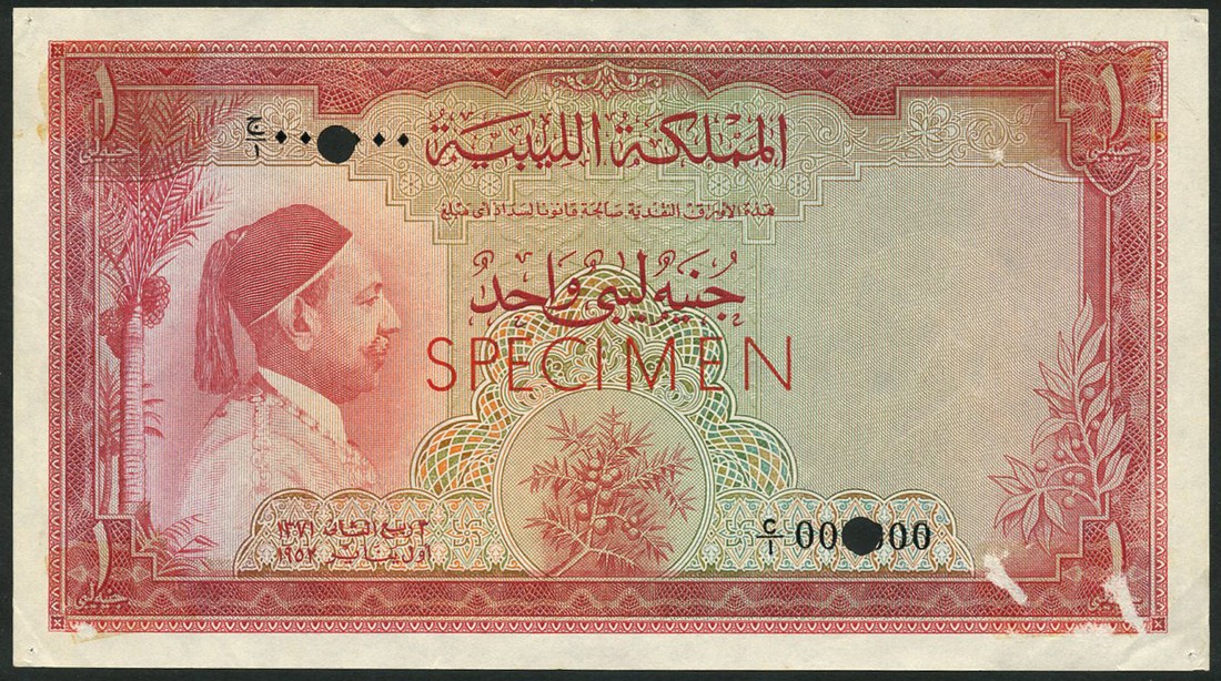 (x) Kingdom of Libya, colour trial £1, 1 January 1952, serial number C/1 000000, red and green, King Idris at left, bush low centre, reverse red