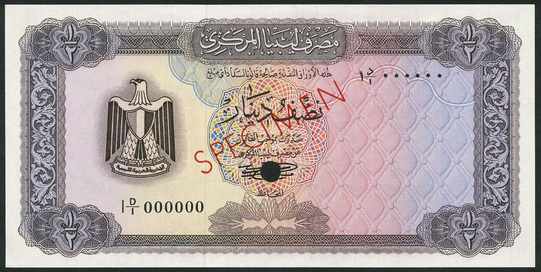 (†) Central Bank of Libya, specimen colour trial ¼ Dinar, ND (1971), serial number 1E/1 000000, reddish purple on multicoloured underprint, arms at left, without Arabic inscription at lower right, reverse doorway at centre, pattern at right; specimen colour trial ½ Dinar, ND (1971), serial number 1D/1 000000, brown on multicoloured underprint, arms at left, without Arabic inscription at lower right, reverse oil refinery, overprinted SPECIMEN in red on obverse and reverse, one punch hole
