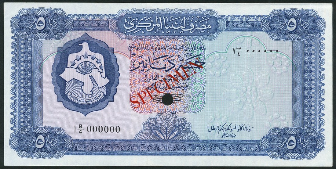 (†) Central Bank of Libya, specimen colour trial 5 Dinars, ND (1972), serial number 1B/4 000000, blue on multicoloured underprint, shield, cog and map of North Africa and Middle East at left, with Arabic inscription at lower right, reverse walled fortress, value in each corner, overprinted SPECIMEN in red on obverse and reverse, one punch hole