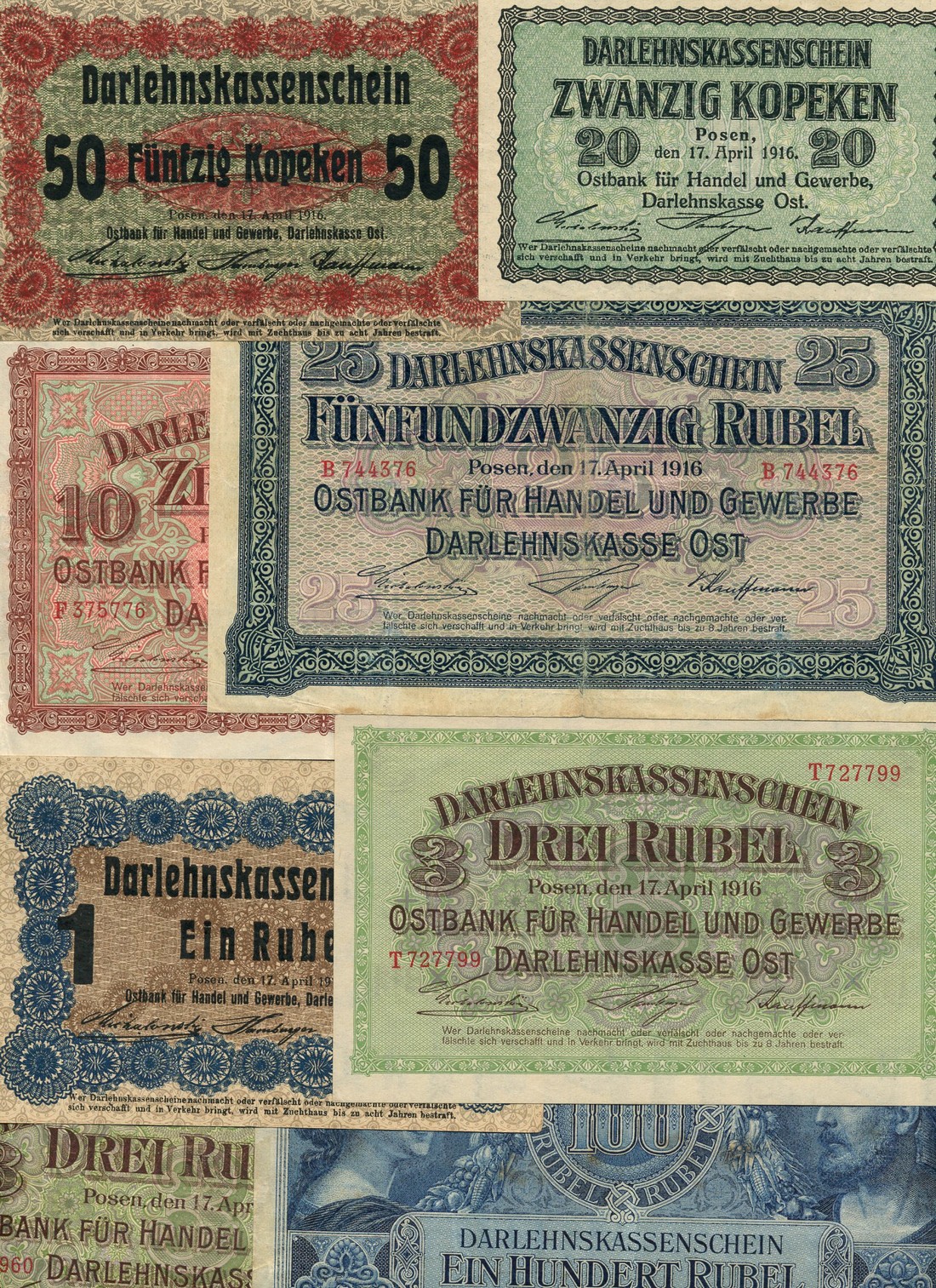 Bank of Lithuania, 1 ,5 and 10 centai, September 1919, 1,5,10 and 20 centu, November 1922, 10 centu (2), 20 centu (2), 1922, 10 litu (2), 1927, green, 5 litai (2), 1929, 20 litu, 1930, brown and green, also Posen, State Loan Bank, Occupation of Lithuania, World War I, 20 and 50 kopeken, 1 rubel (2),3 rubel,10 rubel,25 rubel and 100 rubel, 1916, blue, allegorical figure top left and right