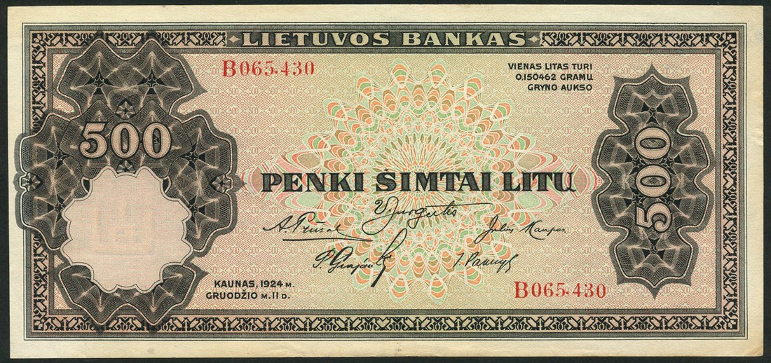 Bank of Lithuania, 500 litu, 11 December 1924, red serial number B 065430, black, pink and pale green, value at left and right, reverse blue and multicoloured, arms top centre, value in field, plus 50 litu, 1928, blue, 100 litu, 1928, 20 litu, 1930, brown and green and pale orange, Grand Duke Vytautas the Great at left