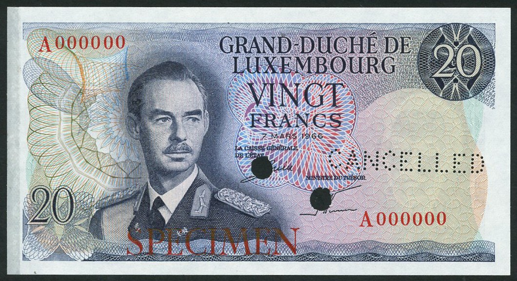 (†) Grand Duche de Luxembourg, specimen colour trial 10 Francs, 20 March 1967, serial number A000000, brown on multicoloured underprint, portrait of Grand Duke Jean at left, Grand Duchess Charlotte Bridge; also specimen 20 Francs, 20 march 1967, serial number A000000, blue on multicoloured underprint, Grand Duke Jean at left, reverse River Moselle, both overprinted SPECIMEN in red on obverse and reverse, two punch holes
