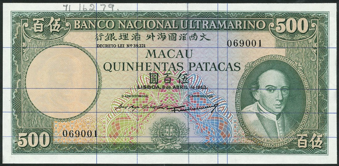 (†) Banco Nacional Ultramarino, Macau, printer's positional proof 10 Patacas, 8 April 1963, serial number 4140001, blue on multicoloured underprint; printer's positional proof 500 Patacas, 8 April 1963, serial number 069001, green on multicoloured underprint, both Bishop Belchior Carneiro at lower right, reverse woman looking out at ships, both marked with positioning lines in red and/or blue ink