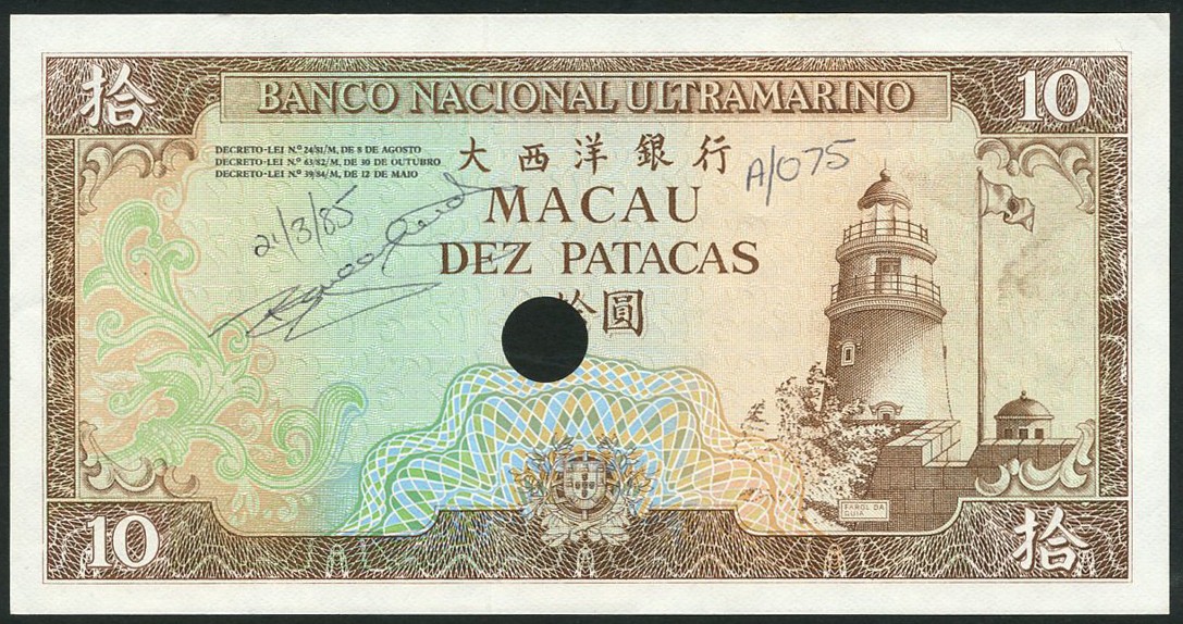 (†) Banco Nacional Ultramarino, Macau, a group of progressive proofs in two booklets for 10 Patacas, ND (1981), the first booklet, dated 19-10-81 and marked '10 Macau Backs', containing three stages of the reverse underprint; the second booklet dated 26-10-81 and marked '10 Pataca fts duplex and decreto' containing four stages of the note in different colour combinations; also 10 Patacas (2), ND (1981), no date, no signatures, brown, lighthouse at right, reverse 19th century harbour scene, one copy approved and dated 21/3/85 in blue ink, both one punch hole