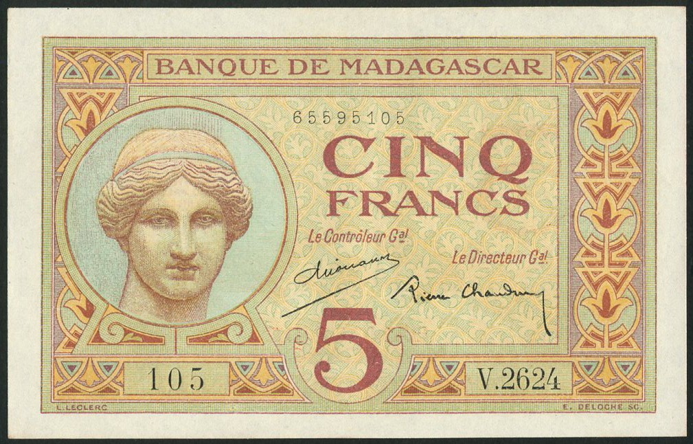 Banque de Madagascar, 5 francs (4), ND (1937), consecutive serial numbers V.2624/106 and 105, plus M.1529 239 and M.1529 266, red brown on multicolour underprint, Goddess Juno at left