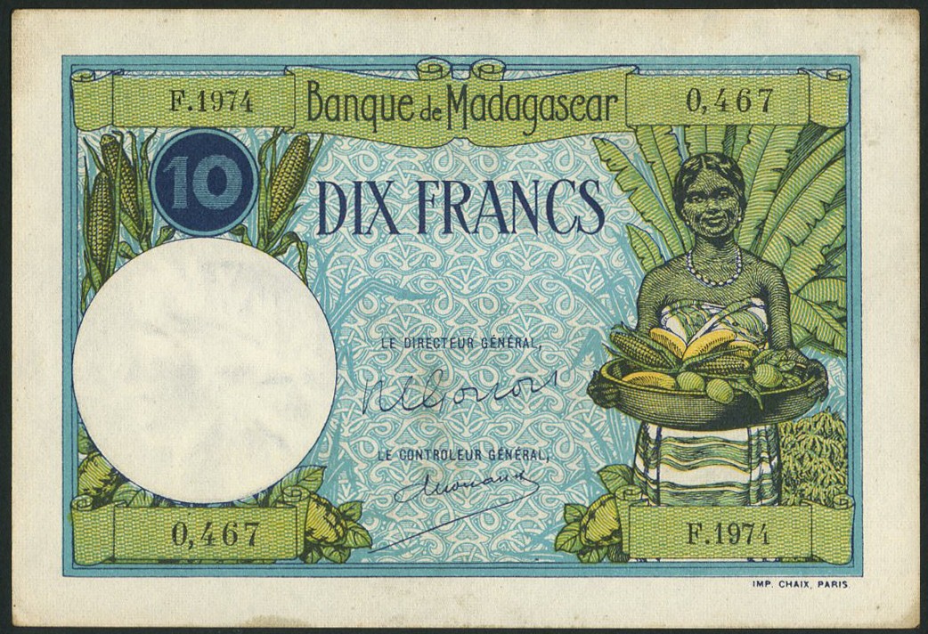 Banque de Madagascar, 5 francs (2), ND (1937), serial numbers J.2509 921 and J.2509 930, red brown on multicolour underprint, Goddess Juno at right, also 10 francs (2), ND (1937-47), consecutive serial numbers F.1974 0,466/7, green and blue, woman at right holding fruit platter, reverse, oxen ploughing field