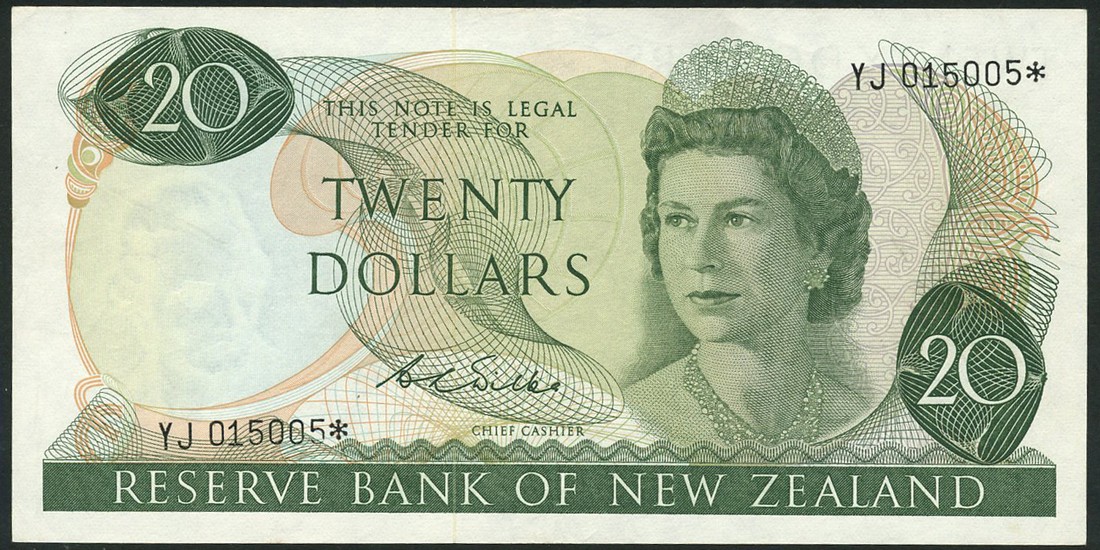 (x) Reserve Bank of New Zealand, $20 (3), ND (1968-81), replacement serial number YJ 015005*, signature Wilks and consecutive serial numbers HC 440001/02, signature Hardie, green on multicoloured underprint, portrait of Queen Elizabeth II at right, reverse miro at left, pigeon at centre