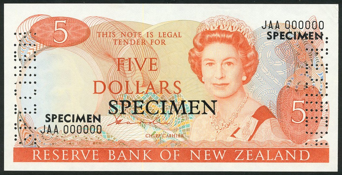 (x) Reserve Bank of New Zealand, specimen 5 dollars, ND (1981-85), serial number JAA 000000, orange on multicolour underprint, Queen Elizabeth II at right, reverse tui bird at centre, kowhai flower centre left, black stamped SPECIMEN on obverse and reverse, hole punched SPECIMEN right and left