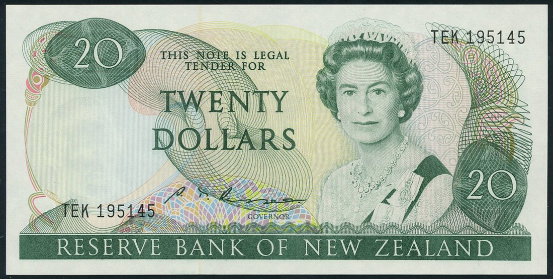 (x) Reserve Bank of New Zealand, $20 (2), ND (1985), serial number TEK 195145/195148, green and multicoloured, Elizabeth II at right, Russell signature