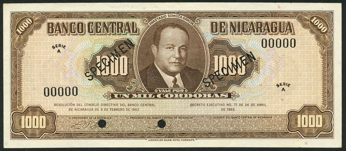 (x) Banco Central de Nicaragua, specimen 1000 cordobas, 1962, zero serial numbers brown on multicolour underprint, A Somoza at centre, value at centre left and right, and each corner, reverse brown, F. Hernandez Cordoba at centre, black SPECIMEN overprint and two cancellation holes