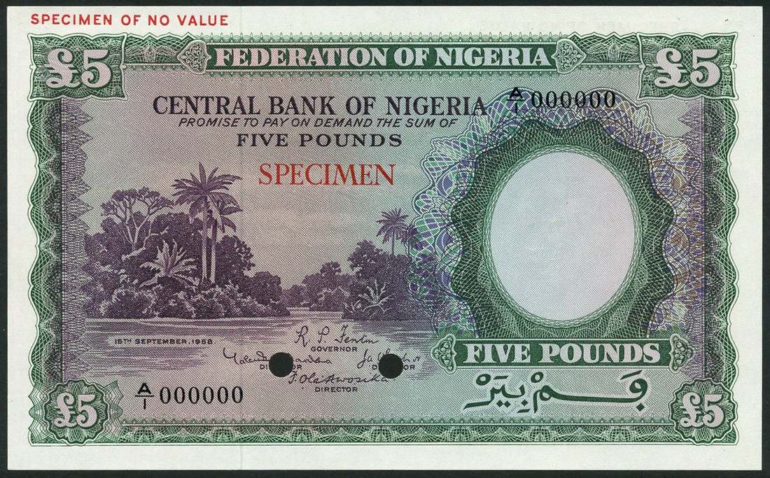 (†) Federation of Nigeria, Central Bank, a set of specimen colour trials, 15 September 1958, all river scene and palm trees at left, comprising 5 Shillings, serial number J/1 000000, brown and green, reverse palms; 10 Shillings, serial number E/1 000000, red and black, reverse crop sowing; £1, serial number A/1 000000, blue and green, reverse harvesting cacao; and £5, serial number A/1 000000, green, men harvesting fruit, all overprinted SPECIMEN in red on obverse and reverse, two punch holes