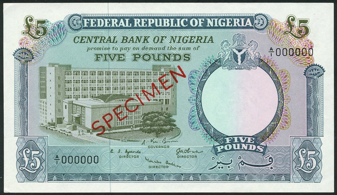 (†) Federal Republic of Nigeria, a set of specimens of the ND (1967) issues, all Central Bank building at left, comprising 5 Shillings, serial number A/1 000000, purple and blue, reverse logging; 10 Shillings, serial number A/12 000000, green and brown, reverse stacking grain; £1, serial number A/1 000000, red and brown, reverse man beating dates; and £5, blue-grey and blue-green, serial number A/1 000000, cacao bean preparation, all overprinted SPECIMEN in red with two De La Rue specimen ovals on obverse and reverse, four punch holes, except £5 overprinted SPECIMEN only