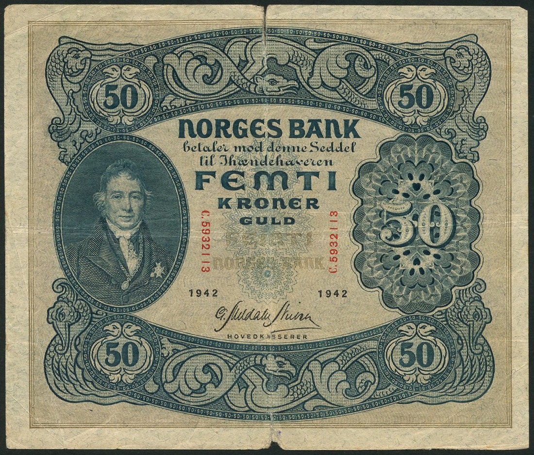 Norges Bank, 5 Kroner, 1943, red serial number V. 8339469, blue green, 10 kroner, 1941, red serial number A. 7894021, blue, beige and violet, 50 kroner, 1942, red serial number C. 5932113, dark green and pale violet, President Christie at left, also Steffens emergency issue 5 norske kroner, serial number A. 2042 Voss (near Bergen), 14 April 1940, black text on cream paper, signature of Steffens low centre