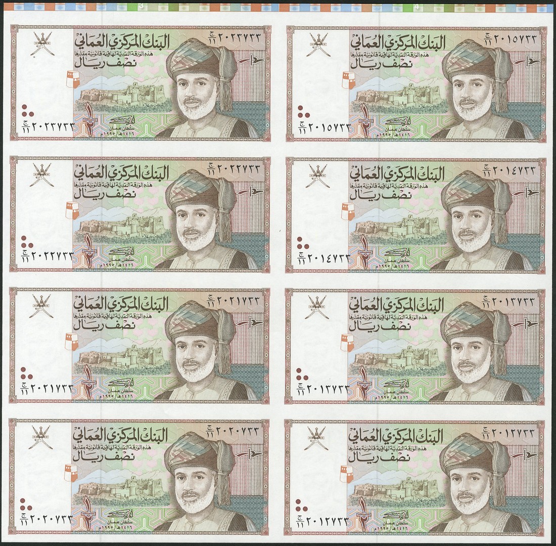 (x) Central Bank of Oman, uncut sheet containing eight half dinar notes, ND (1995), dark brown and grey on multicolour underprint, Sultan Qaboos bin Sa'id at right, Bahla Castle at centre, arms at top left, reverse Nakhl Fort at centre