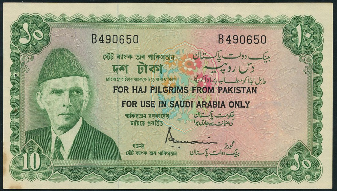 State Bank, Haj issue, Pakistan, 10 rupees, ND (ca 1950), serial number B 490650, green and multicoloured, President Ali Jinnah at left, Durrani signature, black overprint FOR HAJ PILGRIMS FROM PAKISTAN FOR USE IN SAUDI ARABIA ONLY, reverse green, Shalimar Gardens, Lahore, at centre
