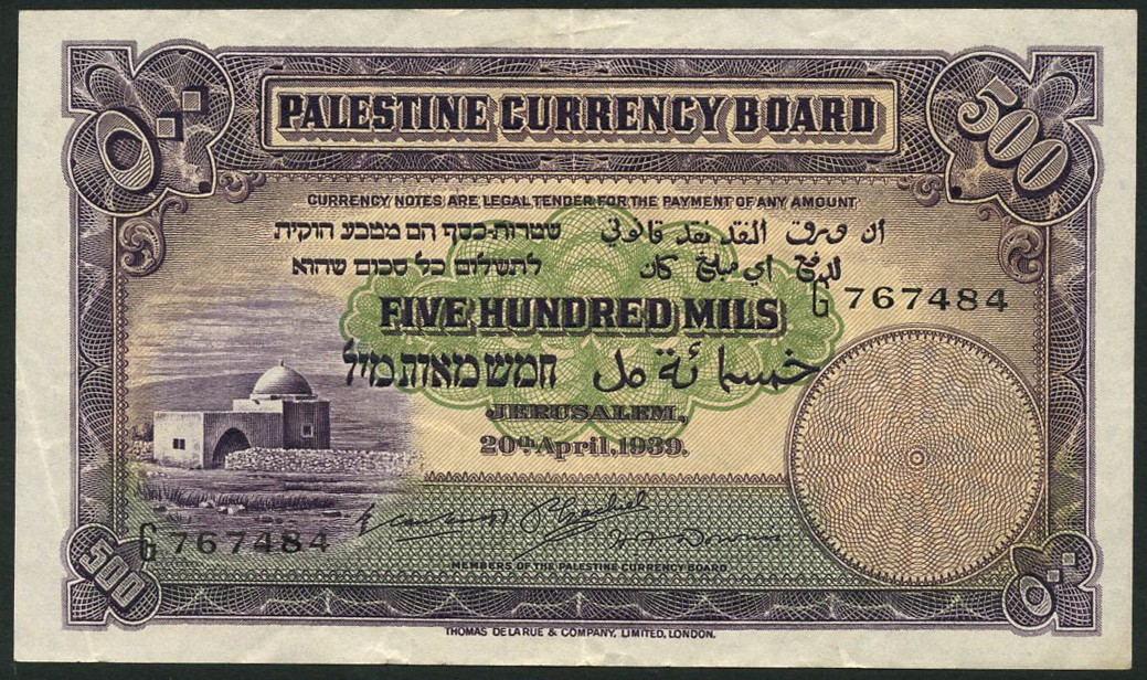 Palestine Currency Board, 500 mils, 20 April 1939, serial number G 767484, purple and pale orange, Rachels Tomb at Bethlehem low left, pale blue central guilloche, value at centre and at each corner, three printed signatures of Sir John Caulcutt, Sir Percy Ezechiel and H.F.Downie, reverse purple, the Tower of David at centre