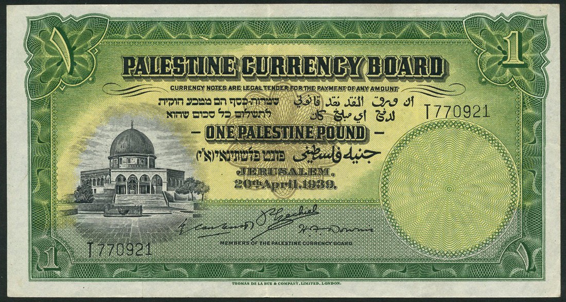 Palestine Currency Board, £1, 20 April 1939, serial number T 770921, green and pale yellow, The Dome on the Rock, Jerusalem at left, value in lilac guilloche at centre, value at each corner, three printed signatures of the Members of the Palestine Currency Board, Sir John Caulcutt, Sir Percy Ezchiel and H.F. Downie at low centre, reverse green, the Citadel of Jerusalem with the Tower of David at centre, value at left and right and low centre