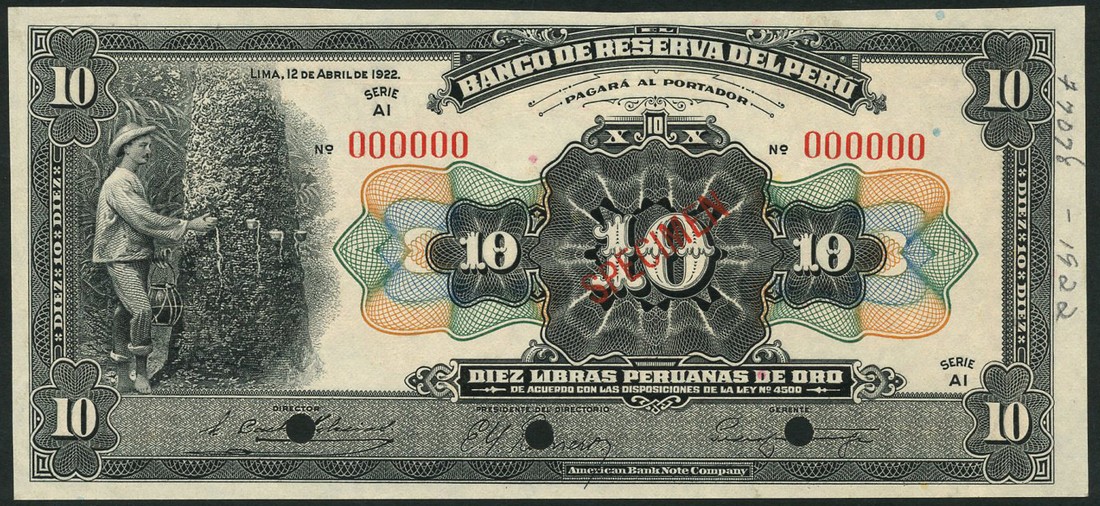 (x) Banco de Reserva del Peru, a specimen set of the 1922 issue, comprising 1/2 libra, Liberty at centre, 1 libra, seated woman at left, 5 libras, child with sheep and lamb at right and 10 libras, rubber tree and worker at left, all black on multicolour underprint, red SPECIMEN overprints, three cancellation holes