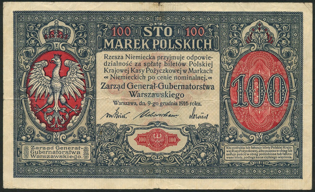 Polish State Loan Bank, 20 zlotych, 1917, serial number A.0840648, black and red and pale mauve, crowned eagle at centre, text at left 'Zarad jeneral-gubernatorstwa', reverse mauve and green, medallic helmeted female head at top left and right, and 100 zlotych (2), 1916, red serial number A.3634677, A.2668720, blue-black and red and pale blue-green, crowned eagle at left, text at left 'Zarad General-Gubernatorstwa' , reverse blue and salmon-pink, medallic helmeted female head at left and right
