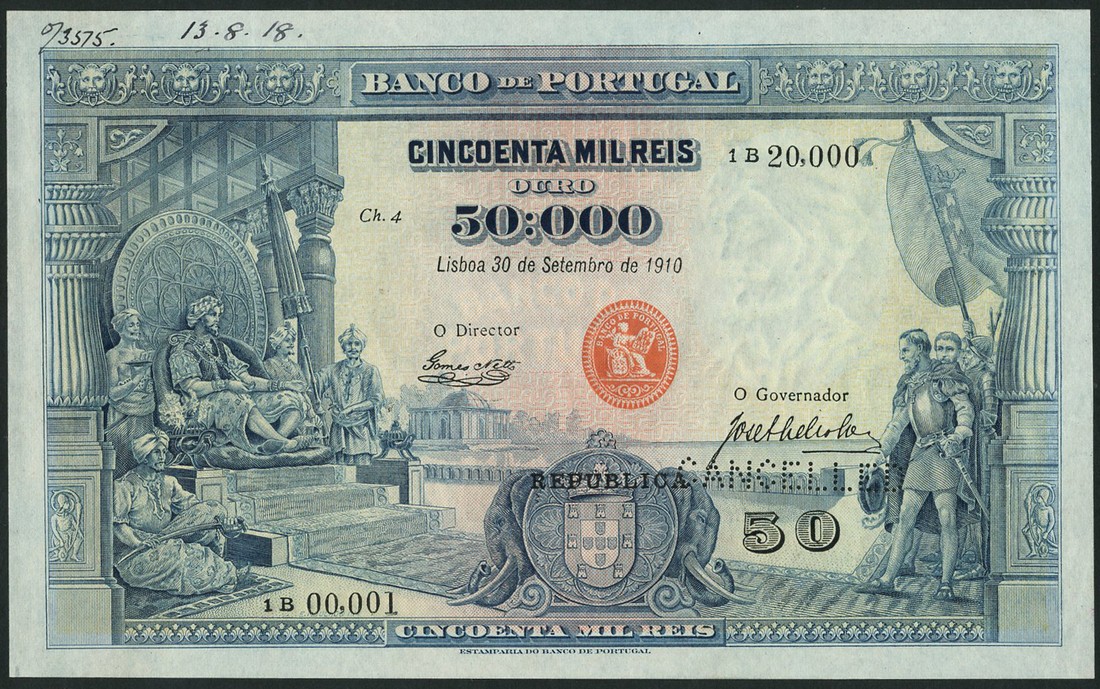 (†) Banco de Portugal, specimen 50 mil reis, 30 September 1910, serial number 1B 00001-1B 20000, Ch4, blue and pale blue-green, Middle Eastern potentate at left with courtiers, Portuguese delegation at right seeking audience, arms low centre, red Bank seal at centre, reverse blue, medal of Lusitania at right