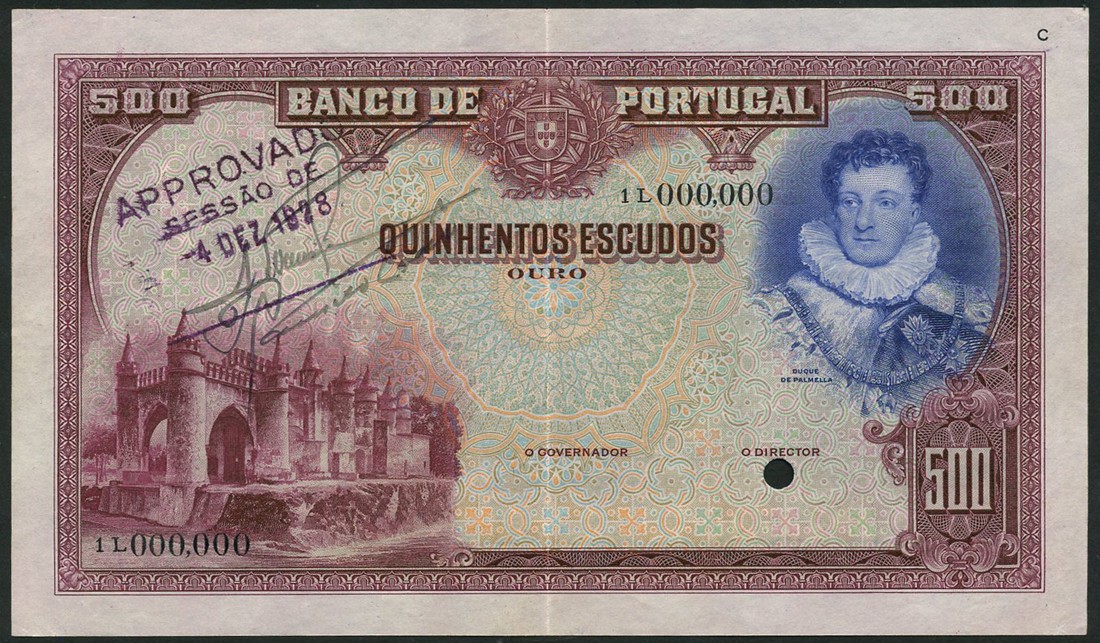 (†) Banco de Portugal, specimen proof 500 Escudos, ND (1928), serial number 1L 000,000, purple and blue on multicoloured underprint, portrait of Duque de Palmella at upper right, castle at lower left, arms at top centre, reverse green, bank arms at left, horses and carts beneath two trees at centre, one punch hole; also original envelope used for approval in 1928