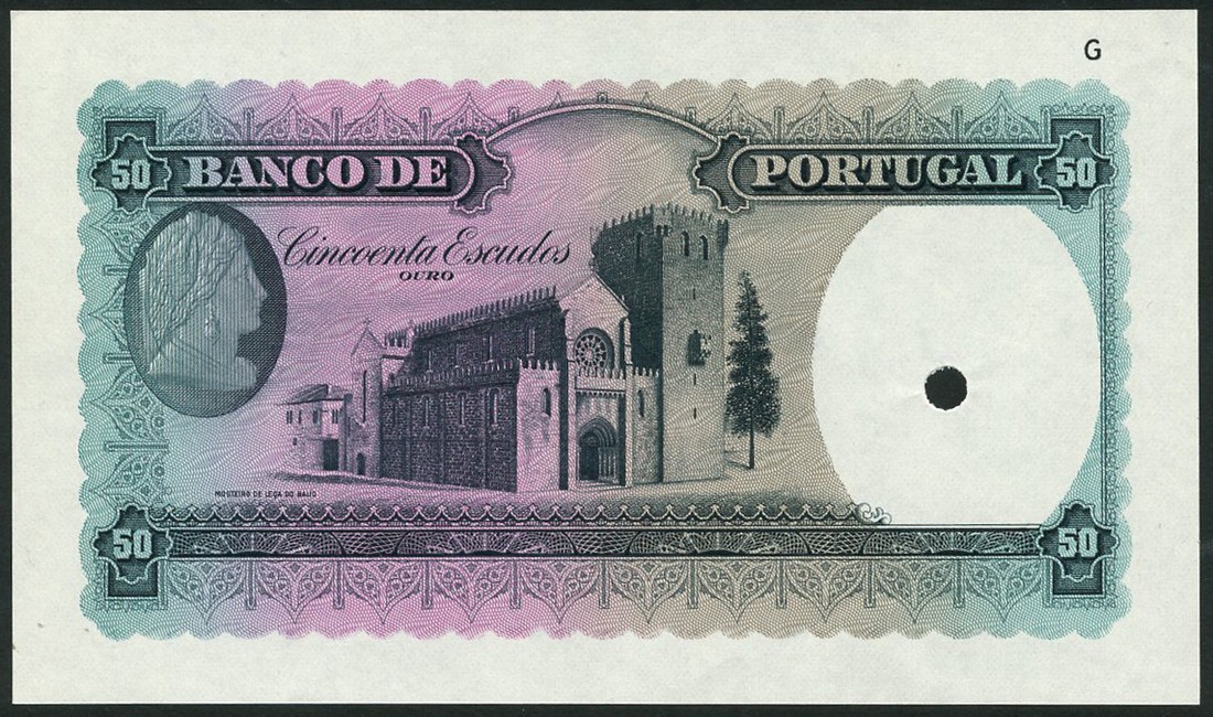 (†) Banco de Portugal, specimen reverse proof 50 Escudos, ND (1941), brown-violet, lilac and blue-green, monastery at centre, medallic female head in oval at left, value in each corner, no watermark, one punch hole