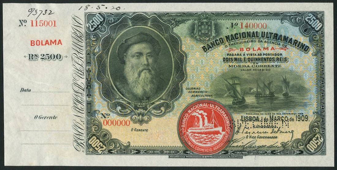 (†) Banco Nacional Ultramarino, Portuguese Guinea, printer's archival specimen 2500 Reis with counterfoil, 1 March 1909, serial run 000000 to 140000, black on blue and yellow underprint, portrait of Vasco da Gama at left, passage of ships round The Cape of Good Hope at right, steamship seal Type III at lower centre, red overprint BOLAMA at upper right centre, reverse blue, allegorical woman looking out at sailing ships, perforated SPECIMEN