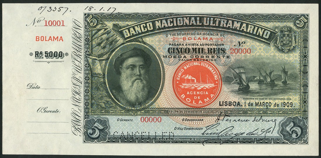 (†) Banco Nacional Ultramarino, Portuguese Guinea, specimen 5 Mil Reis with counterfoil, 1 March 1909, black on pale blue and yellow underprint, portrait of Vasco da Gama at left, passage of ships round The Cape of Good Hope at right, overprinted BOLAMA in red, steamship seal Type I at centre, reverse green and multicoloured, allegorical woman looking out at sailing ships, perforated CANCELLED