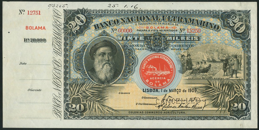 (†) Banco Nacional Ultramarino, Portuguese Guinea, printer's archival specimen 20 Mil Reis with counterfoil, 1 March 1909, serial run 00000 to 15250, black on pale blue and yellow underprint, portrait of Vasco da Gama at left, his embarkation at right, overprinted BOLAMA in red, steamship seal Type I at centre, reverse vermilion and multicoloured, allegorical woman looking out at sailing ships, perforated CANCELLED
