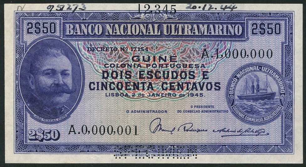 (†) Banco Nacional Ultramarino, Portuguese Guinea, printer's archival specimen 2.5 Escudos, 2 January 1945, serial number run A.0,000,001 to A.1,000,000, violet and multicoloured, portrait of Joao Teixeira Pinto at left, steamship seal at right, reverse arms at top centre, value at lower centre set in geometric pattern, perforated SPECIMEN