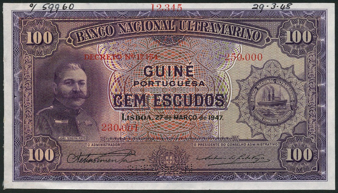 (†) Banco Nacional Ultramarino, Portuguese Guinea, printer's archival specimen 100 Escudos, 27 March 1947, serial number run 230,001 to 250,000, deep purple and multicoloured, portrait of Joao Teixeira Pinto at left, steamship seal at right, reverse purple and pale green, allegorical woman looking out at sailing ships, perforated SPECIMEN