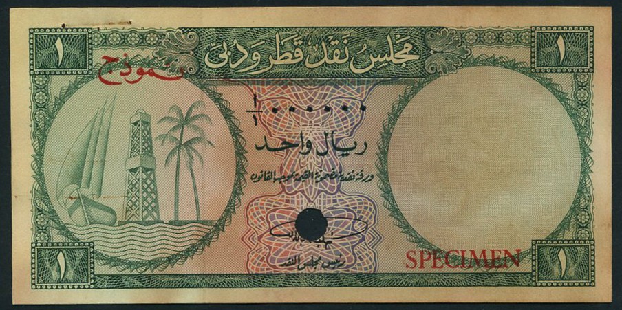 (x) Qatar & Dubai Currency Board, specimen 1 riyal, ND (1960's), serial number A/1 000000, green on multicolour underprint, Dhow, Oil Derrick and Palm at left, value at each corner, reverse value at centre, one cancellation hole, red SPECIMEN overprint in English and Arabic on obverse and reverse