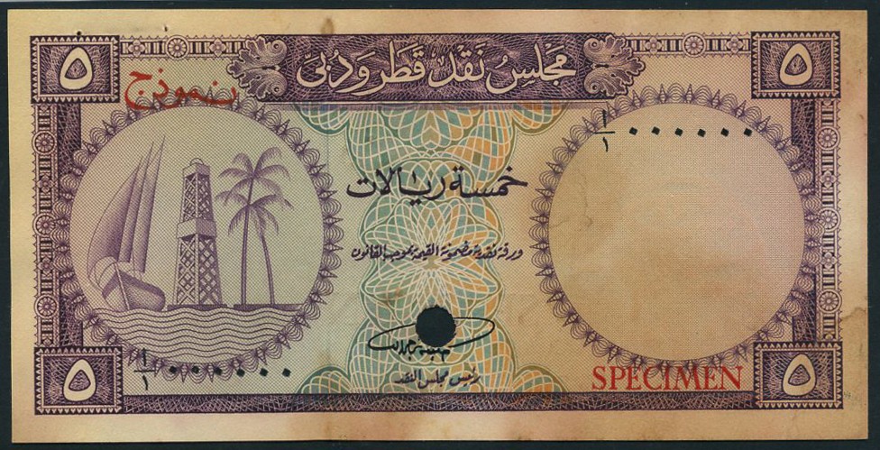 (x) Qatar & Dubai Currency Board, specimen 5 riyals, ND (1960's), serial number A/1 000000, purple on multicolour underprint, Dhow, Oil Derrick and Palm at left, value at each corner, reverse value at centre, one cancellation hole, red SPECIMEN overprint in English and Arabic on obverse and reverse