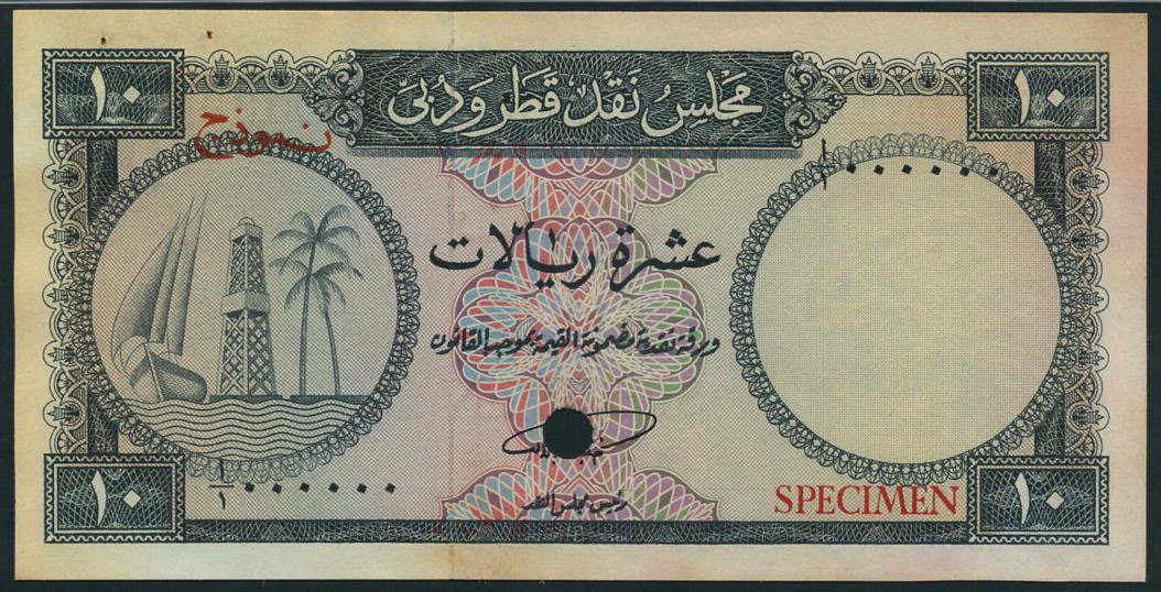 (x) Qatar & Dubai Currency Board, specimen 10 riyals, ND (1960's), serial number A/1 000000, black on multicolour underprint, Dhow, Oil Derrick and Palm at left, value at each corner, reverse value at centre, one cancellation hole, red SPECIMEN overprint in English and Arabic on obverse and reverse
