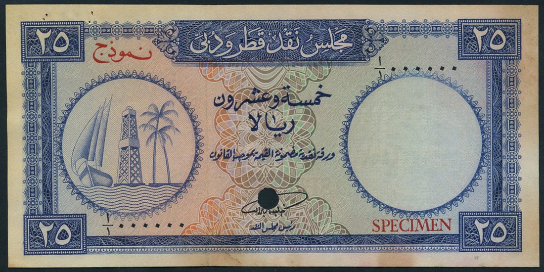 (x) Qatar & Dubai Currency Board, specimen 25 riyals, ND (1960's), serial number A/1 000000, blue on multicolour underprint, Dhow, Oil Derrick and Palm at left, value at each corner, reverse value at centre, one cancellation hole, red SPECIMEN overprint in English and Arabic on obverse and reverse