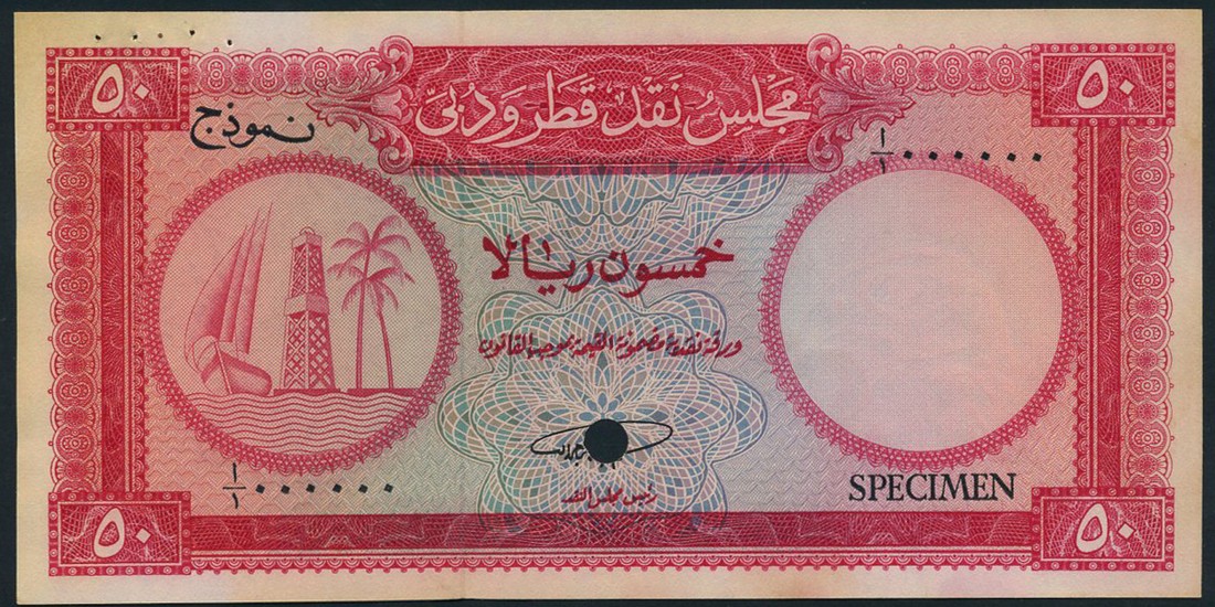 (x) Qatar & Dubai Currency Board, specimen 50 riyals, ND (1960's), serial number A/1 000000, red on multicolour underprint, Dhow, Oil Derrick and Palm at left, value at each corner, reverse value at centre, one cancellation hole, red SPECIMEN overprint in English and Arabic on obverse and reverse