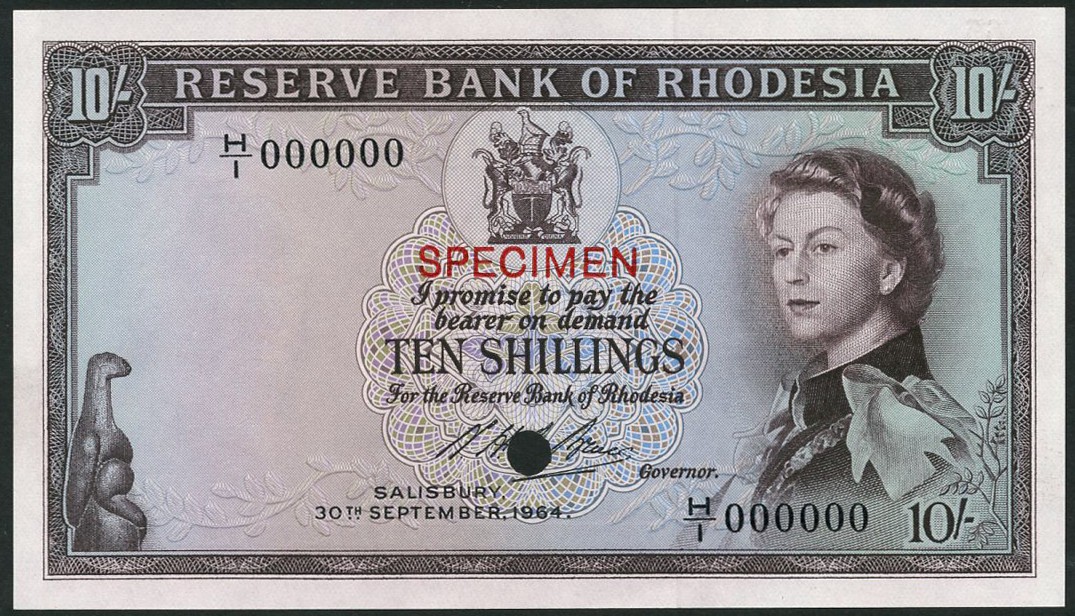 (†) Reserve Bank of Rhodesia, specimen colour trial 10 Shillings, number 63, 30 September 1964, serial number H/1 000000, brown on pale blue and lilac underprint, Annigoni portrait of Queen Elizabeth II at right, arms at top centre, reverse tobacco field, overprinted SPECIMEN in red on obverse and reverse, one punch hole