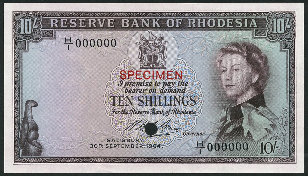 (†) Reserve Bank of Rhodesia, specimen colour trial 10 Shillings, number 64, 30 September 1964, serial number H/1 000000, brown on pale blue and lilac underprint, Annigoni portrait of Queen Elizabeth II at right, arms at top centre, reverse tobacco field, overprinted SPECIMEN in red on obverse and reverse, one punch hole