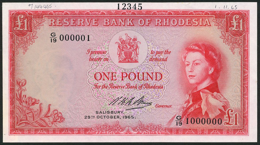 (†) Reserve Bank of Rhodesia, printer's archival specimen £1, 29 October 1965, serial run G/19 000001 to G/19 1000000, red on multicoloured underprint, Annigoni portrait of Queen Elizabeth II at right, arms at top centre, reverse Victoria Falls,