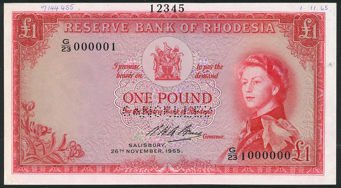 (†) Reserve Bank of Rhodesia, printer's archival specimen £1, 26 November 1965, serial run G/23 000001 to G/23 1000000, red on multicoloured underprint, Annigoni portrait of Queen Elizabeth II at right, arms at top centre, reverse Victoria Falls, perforated CANCELLED