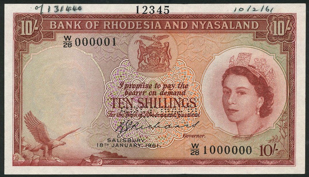 (†) Bank of Rhodesia & Nyasaland, printer's archival specimen 10 Shillings, 18 January 1961, serial run W/28 000001 to W/28 1000000, signature Richards, reddish brown on multicoloured underprint, portrait of Queen Elizabeth II at right, arms at upper centre, reverse river scene, perforated SPECIMEN