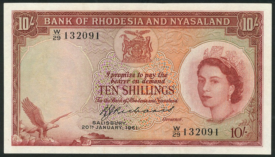 Bank of Rhodesia and Nyasaland, 10/-, 20 January 1961, serial number W/29 132091, red-brown and multicoloured, eagle low left, Elizabeth II at right, arms top centre, Richards signature
