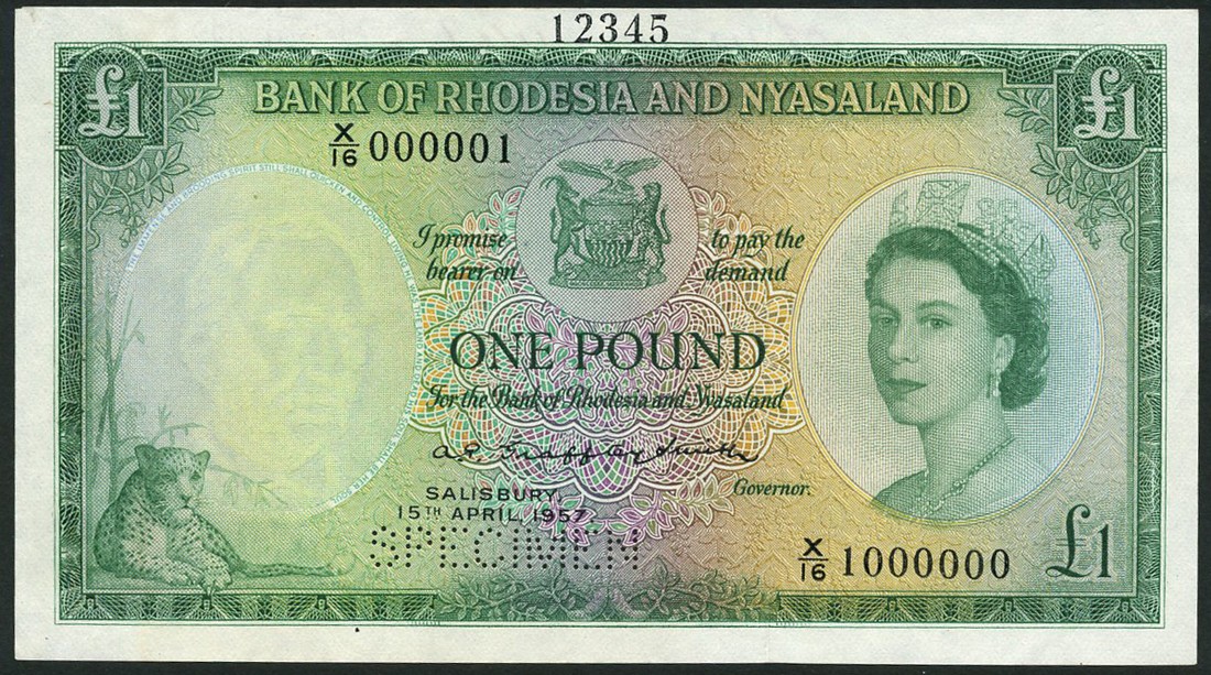 (†) Bank of Rhodesia & Nyasaland, printer's archival specimen £1, 15 April 1957, serial run X/16 000001 to X/16 1000000, signature Grafftey-Smith, green on multicoloured underprint, portrait of Queen Elizabeth II at right, arms at upper centre, reverse Zimbabwe ruins, perforated SPECIMEN