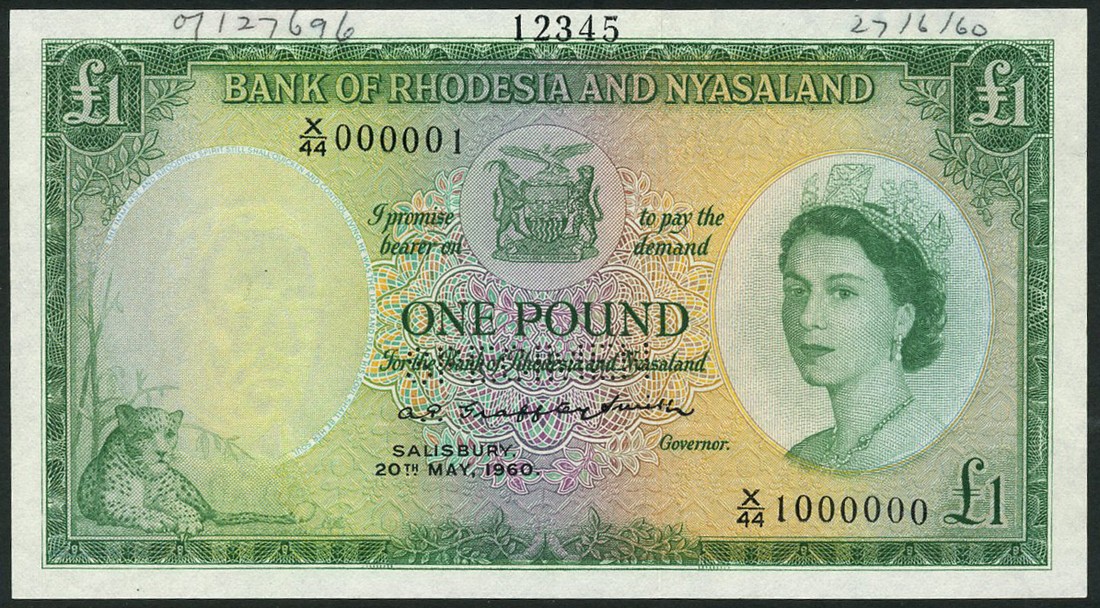 (†) Bank of Rhodesia & Nyasaland, printer's archival specimen £1, 20 May 1960, serial run X/44 000001 to X/44 1000000, signature Grafftey-Smith, green on multicoloured underprint, portrait of Queen Elizabeth II at right, arms at upper centre, reverse Zimbabwe ruins, perforated SPECIMEN