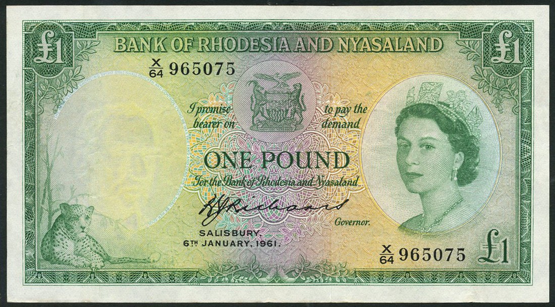 Bank of Rhodesia and Nyasaland, £1, 6 January 1961, serial number X/64 965075, green, orange and lilac, Elizabeth II at right, arms top centre, leopard low left, Richards signature, reverse green, ruins