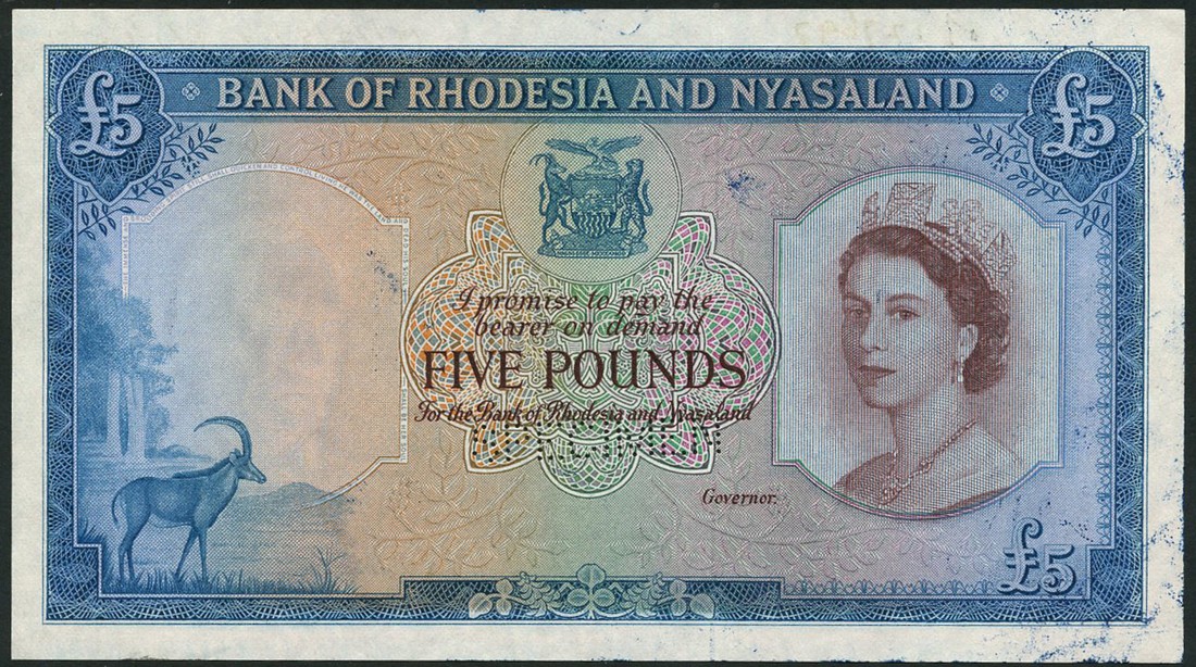 (†) Bank of Rhodesia & Nyasaland, printer's specimen colour proof £5, ND (1960), no serial numbers, no signature, blue and brown-purple on multicoloured underprint, portrait of Queen Elizabeth II at right, arms at upper centre, reverse Victoria Falls, perforated SPECIMEN; also printer's stage colour proof £5, ND (1961), blue and multicoloured, missing Queen's portrait at right, reverse Victoria Falls, perforated SPECIMEN