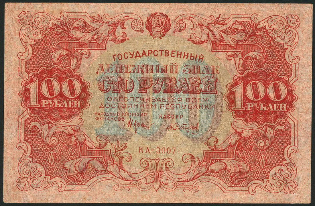 a group of Russian notes including 10 kopeks, ND (1919), green on pale pink, 100 rubles (state promissory note), 1922, red on pale pink and green underprint, 3 rubles, 1919, (north west front), 1919, green on light tan, 1 mark (volunteer western army), 1919, black on brown and light tan underprint, 1 and 3 rubles, 1918, black on light orange and black on green respectively, 5 and 10 rubles (Siberia & Urals), 1918, grey and red respectively