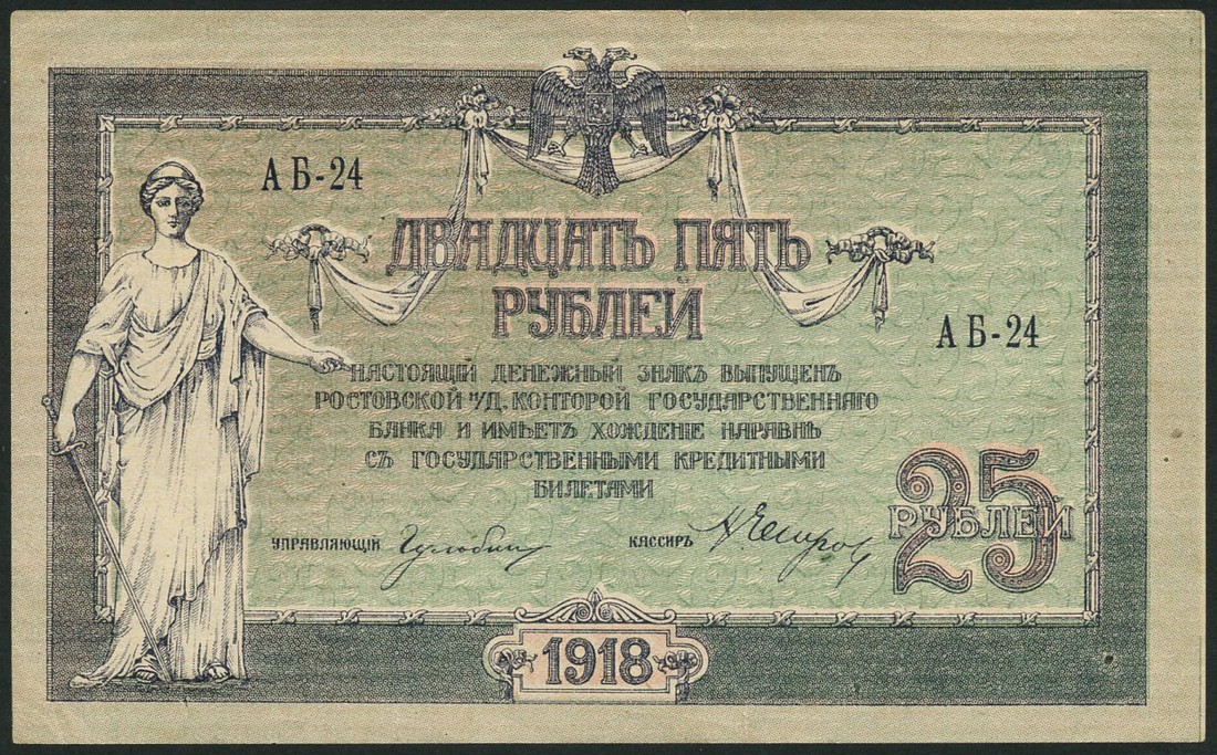 a group of Russian notes consisting of 15 kopeks, ND (1917), brown, 50 kopeks, ND (1918), brown, double eagle at centre, 50 kopeks, ND (1918), black and grey on light orange, 3 rubles, 1918, black and green on orange underprint, 25 rubles, 1918, black and green on light brown underprint, 250 rubles, 1920, lilac brown
