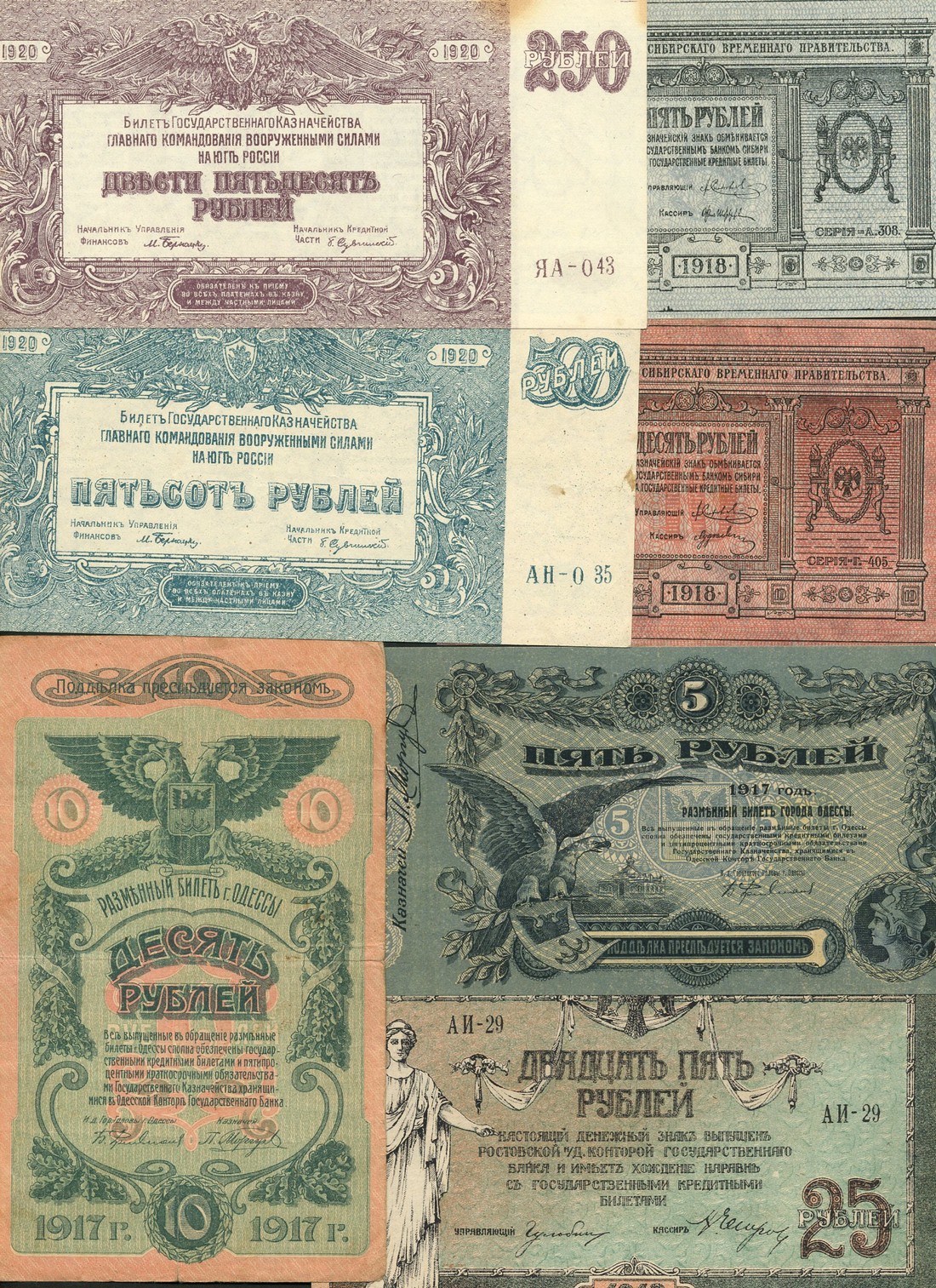 Russia, local issues, a group of regional/local issues, comprising Odessa region, 5 and 10 rubles, 1917, double headed eagles on face, South Russia, 25 rubles, 1918, maiden with sword at left, and 250 and 500 rubles, 1920, red and blue-green respectively, also Siberia, 5 and 10 rubles, 1918 issue, green and red respectively